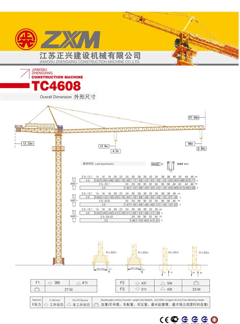 2、最大工作幅度46米,最大起重量4噸,額定起重力矩400KN.M;
